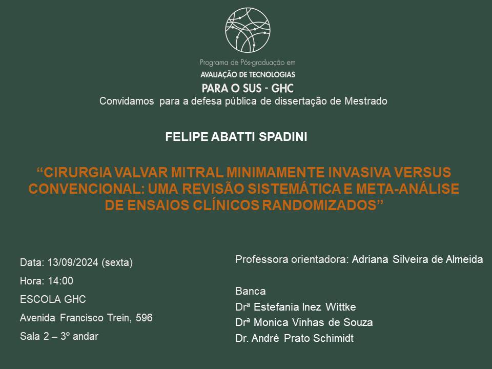 A Gerência de Ensino e Pesquisa – GEP do Grupo Hospitalar Conceição – GHC torna público o Edital do Processo Seletivo Simplificado, visando à seleção de candidatos para preenchimento de vagas disponíveis para estudantes a serem matriculados na condição de aluno(a) especial no Curso de Mestrado Profissional em Avaliação e Produção de Tecnologias para o SUS - MP APTSUS, do Programa de Pós-Graduação em Avaliação de Tecnologias para o SUS - PPG ATSUS, para ingresso nas disciplinas ofertadas no primeiro semestre do ano letivo de 2024. |