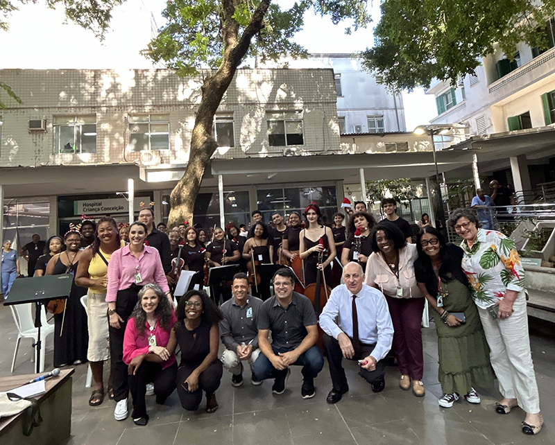 espetáculo, fortemente aplaudido. A atividade teve segmento com quartetos da orquestra, que passaram pelos andares de internação do HCC, realizando pequenas apresentações àqueles que permaneceram nos leitos. Familiares, crianças e trabalhadores escutaram a sinfonia em frente aos quartos e postos. O som dos instrumentos podia ser escutado em outras partes do hospital, criando um clima mais leve ao ambiente. |