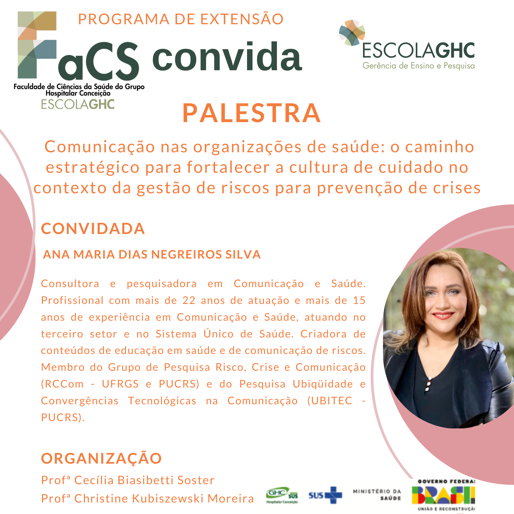Na noite de 11 de março de 2024, a Escola GHC teve a honra de sediar mais uma edição do FaCS Convida, um projeto de extensão que visa compartilhar o conhecimento acadêmico com a comunidade por meio de aulas abertas. A palestra virtual intitulada "Comunicação nas organizações de saúde: o caminho estratégico para fortalecer a cultura de cuidado no contexto da gestão de riscos para prevenção de crises", ministrada pela consultora pesquisadora em Comunicação Social Ana Negreiros, reuniu discentes do Curso Superior de Gestão Hospitalar e trabalhadores do GHC, proporcionando um enriquecedor debate sobre a importância da comunicação nas organizações de saúde. | |